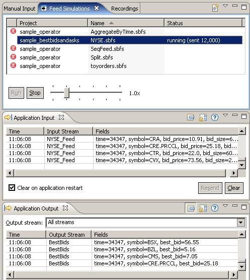 Remember that you must run your StreamBase application before you can use the Feed Simulations view. That is, a StreamBase Server process must be running and hosting the application.