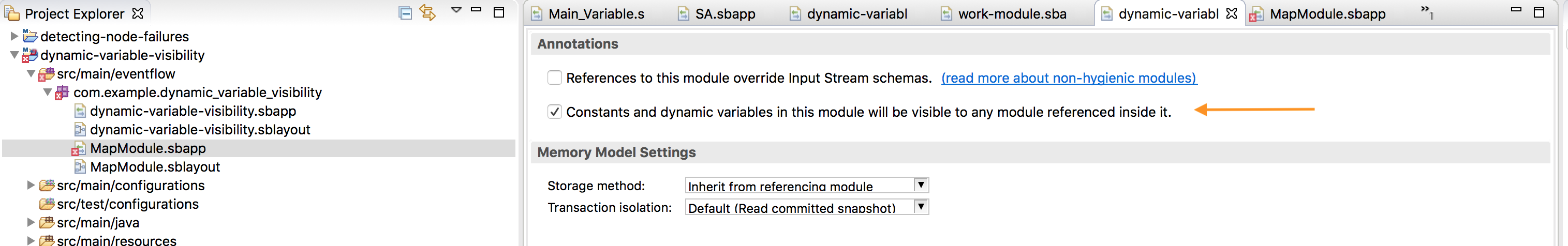 A dynamic variable's value is updated when a tuple is received on the linked input stream or when a tuple is emitted from the linked output stream. The visibility of a dynamic variable is controlled with the following module annotation: