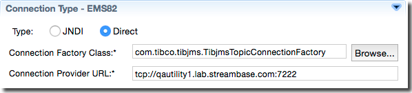See Connection Type Section, JNDI and Connection Type, Direct below for examples and explanations of the fields you must configure in the Connection Type section to allow a simple JMS or EMS connection to proceed.