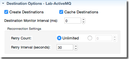 | Create Destinations | Boolean. When selected (the default), this indicates that destinations are to be created when first used. When unselected, this means to look up destinations in JNDI. If supported by the JMS provider, destinations can be created even if they already exist. Creating destinations is faster than looking them up in JNDI. |