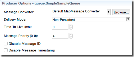 | Disable Message Timestamp | A JMS provider may be able to reduce message overhead when given a hint that a client does not use timestamps. Select this checkbox if your fragment design ignores timestamps. |