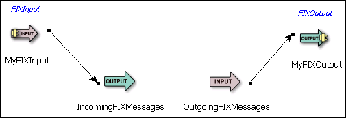 While it is possible to use the FIX Input adapter individually to receive FIX messages, or to use the FIX Output adapter individually to send FIX messages, it is usually more useful to combine their capabilities to both send and receive messages in the same FIX session. To accommodate this, the FIX adapter provides the capability to link an FIX Input adapter with an FIX Output adapter so that they share the same FIX connection and sessions. In EventFlow applications, having separate Input and Output adapter icons that share a connection (instead of a single bidirectional adapter icon) helps minimize the need for loops in the EventFlow logic.
