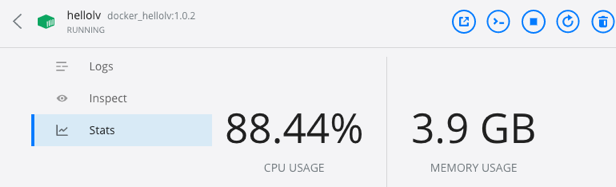 Select a container to see more detail, which opens to the Logs panel. Use the buttons on the top row to run basic start, stop, restart, or delete commands for the running container, and to open a shell prompt inside the container. For LiveView fragments, there is an extra button on the left that lets you open your default web browser on the LiveView Web instance running as part of your LiveView fragment.
