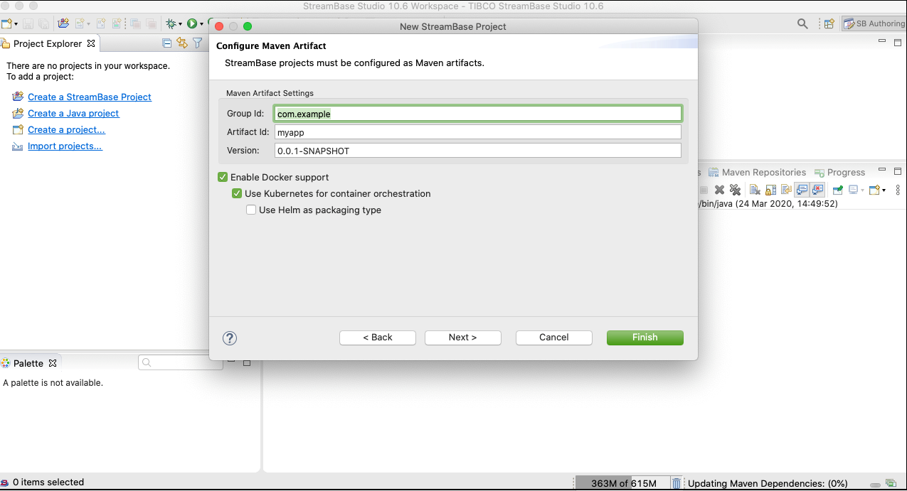 Create a new StreamBase Project, select StreamBase Application, and enable both Use Kubernetes for container orchestration and Use Helm as packaging type.