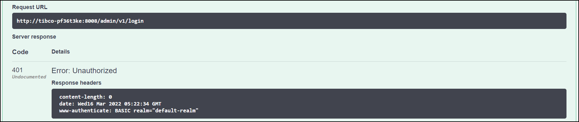 POST /login— Login to admin web service: From REST API, select Try it out and click Execute. The response body presents the username and Password. Enter the login credentials and click Sign in to enter to Admin Web Services. On successful command execution, the file URL is returns Code 200 response box: