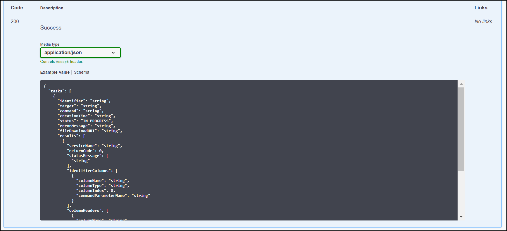 GET /tasks/{taskId} — Get the current status of a task. From the REST API, enter the search string in Task identity. Click Execute. After you run the command successfully, expect to see the current status of a running task. For example: