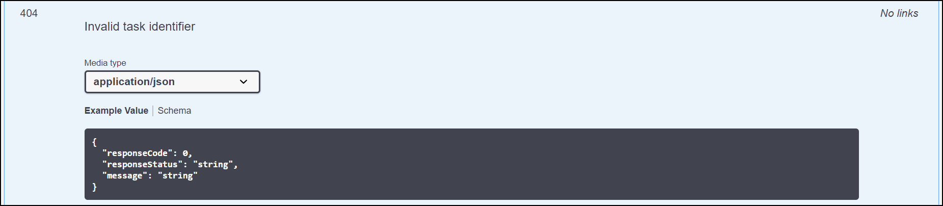 If the entered string does not match with existing tasks, then then URL returns Code 404 response box with Invalid task identifier error: