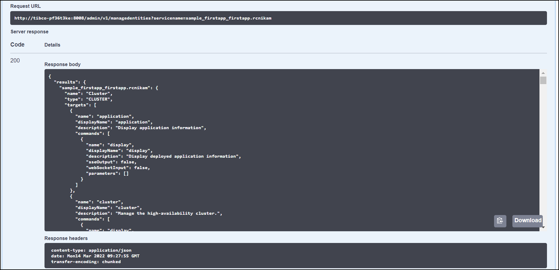 POST /managedentities— Retrieve managed entities graph: From the REST API, enter The service name to get hierarchical entities of clusters. After you click Execute, the Responses body presents the name of all entities present in the given cluster name of an EventFlow fragment. For example:
