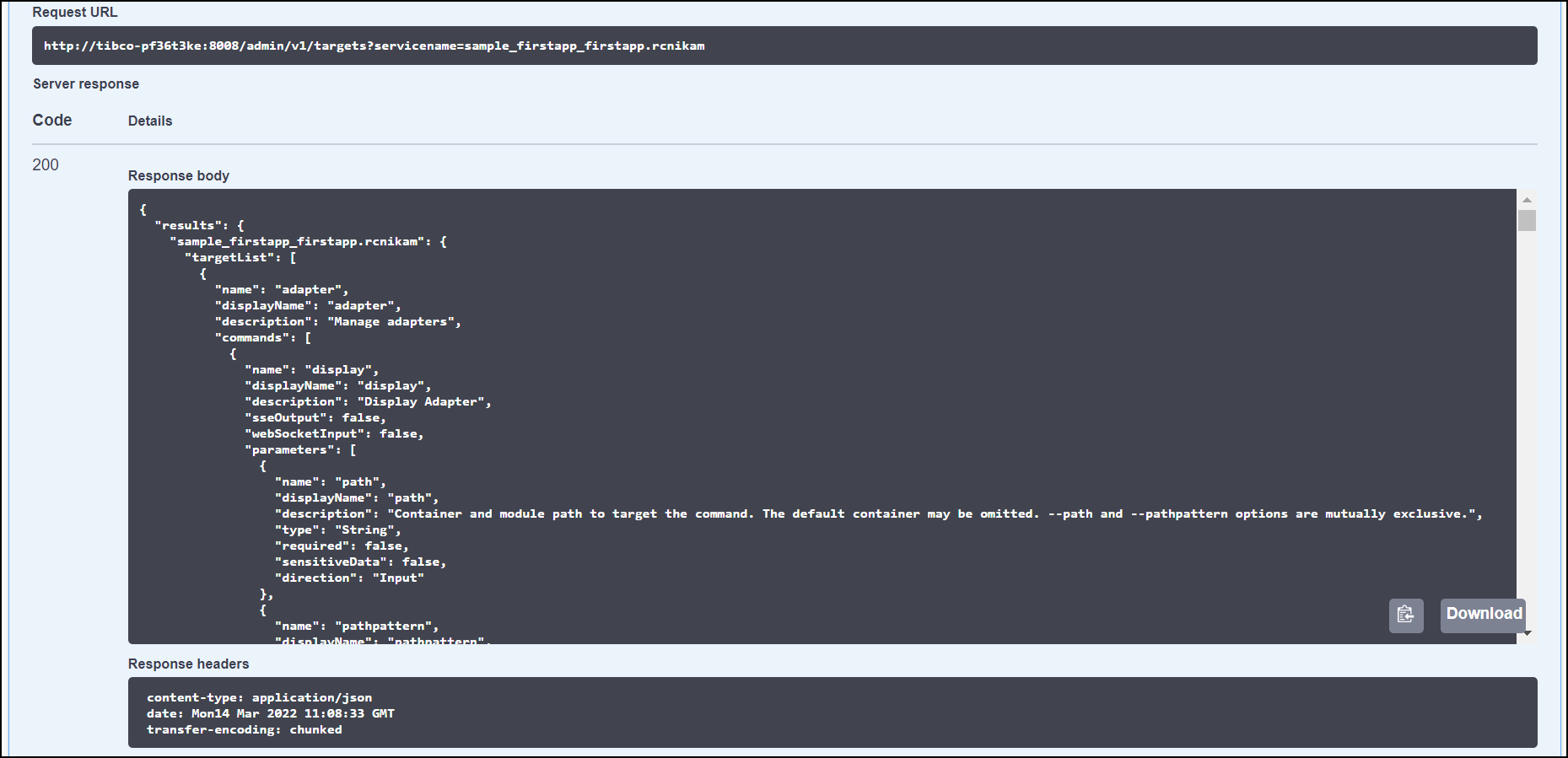 GET /targets/{target}— Get the help information of a target or a command. From the REST API, enter The target name. Enter The service name and, or The command name for the target. After you click Execute, the Responses body presents all information of target and command. For example: