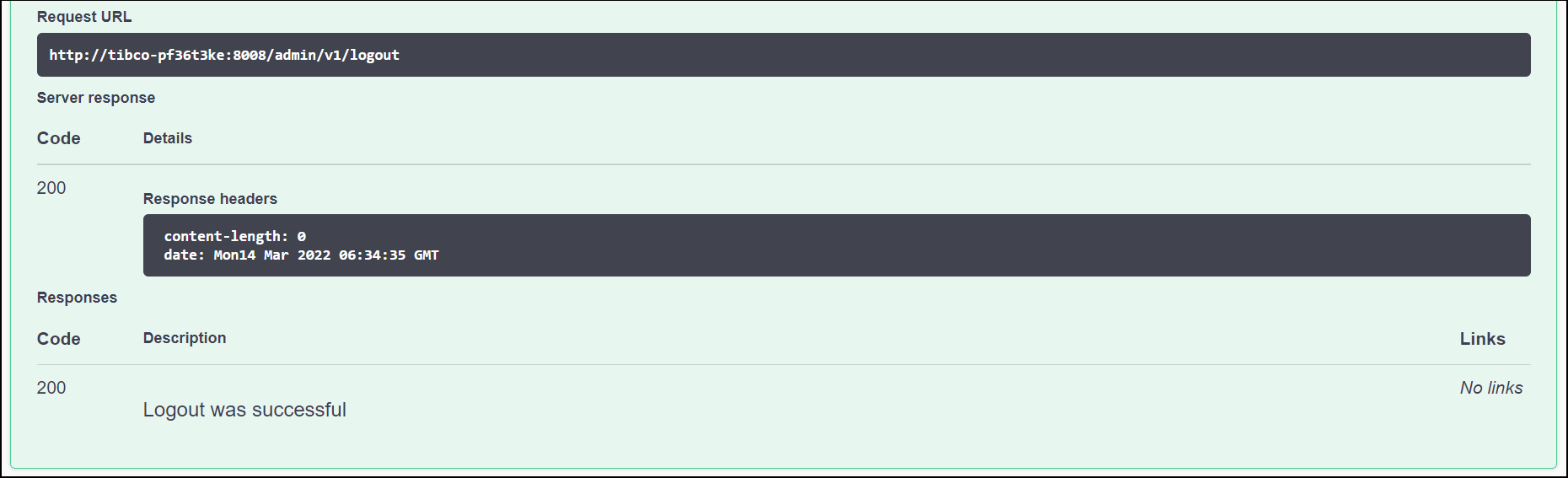 POST /logut— Log off from admin web service: From REST API, select Try it out and click Execute. On successful command execution, the file URL returns Code 200 response box: