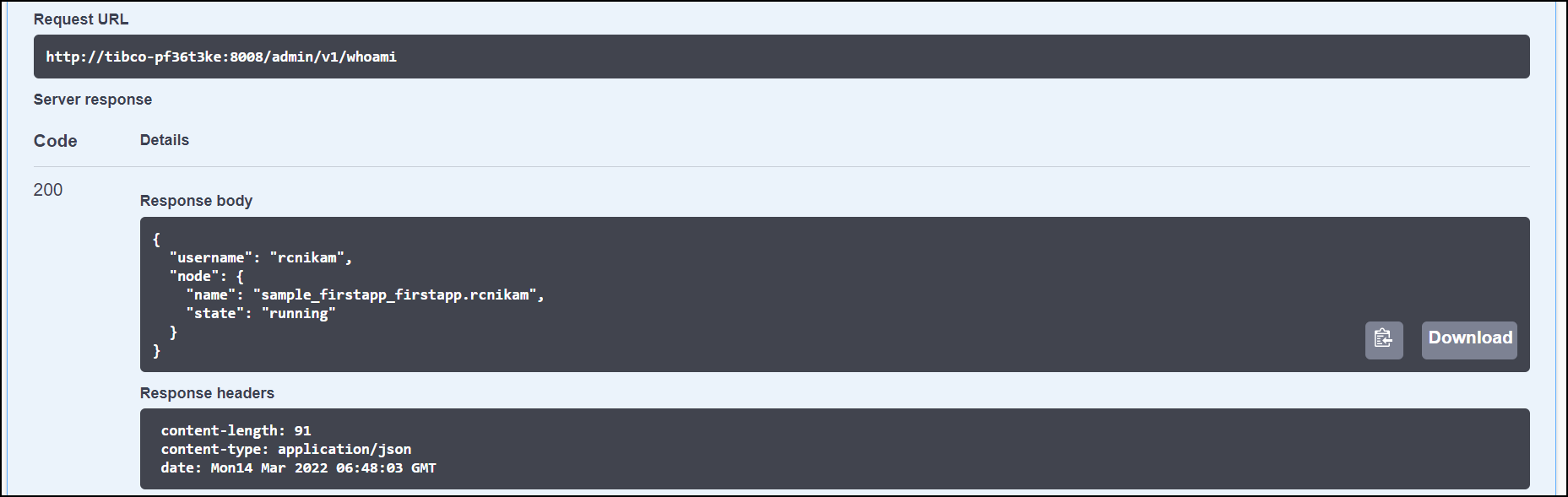 POST /whoami— Retrieving the current username and the node information. The node information contains node name and node state. On successful command execution, the user name and node information are returned in Code 200 responses box: