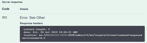 Viewing responses for epadmin enqueue stream command via WebSocket is not supported in the REST API UI. To view the responses in JSON format, copy the location value in the response header to a WebSocket-supported web browser. For example:
