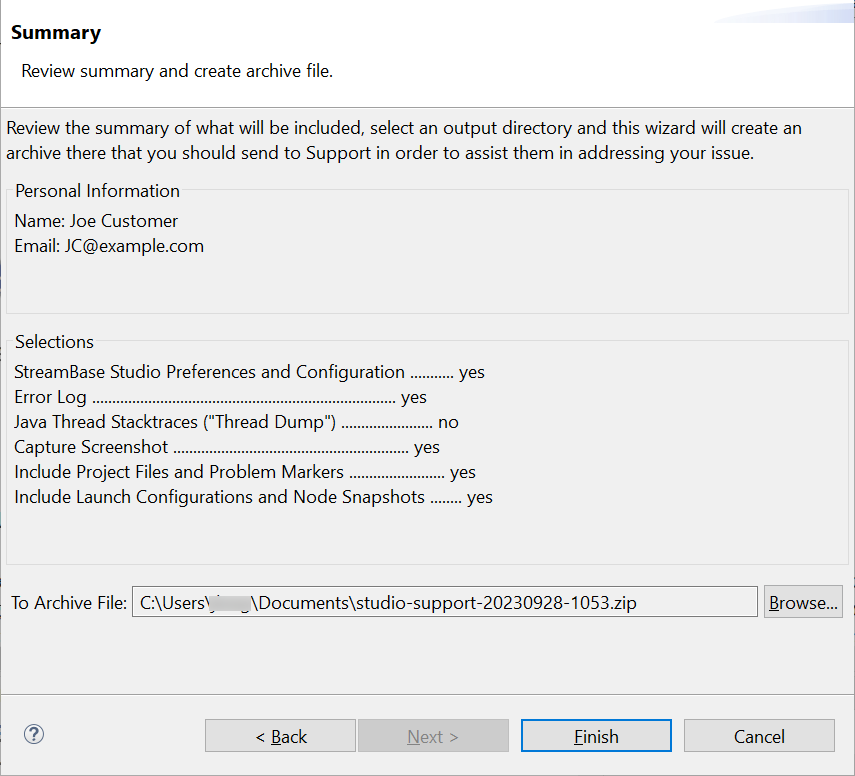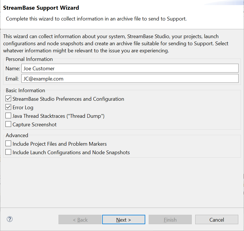 The StreamBase Support Wizard presents a dialog to capture relevant information for your system and applications, and bundle it into an archive (.zip) file. Once bundled, you can send the file to Support per local practice.