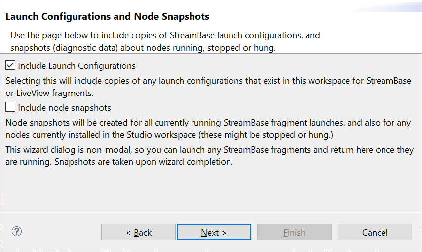Click . In the Launch Configurations and Node Snapshots dialog, choose whether to include copies of StreamBase launch configurations, and snapshots (diagnostic data) about running or stopped nodes.