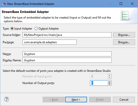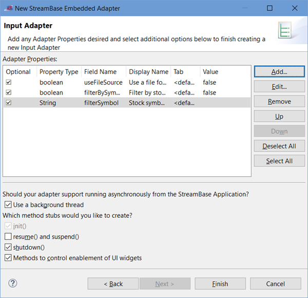 init()method that runs when the adapter is started by its hosting StreamBase Server.Default state for input adapters: enabled and the control dimmed. (That is, the wizard always generates an