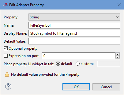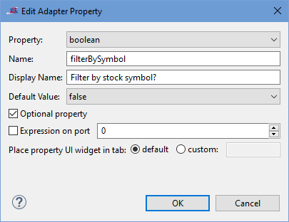 Specify one or more properties that can be set or modified by the users of your adapter to control its operation. For each property you specify, the wizard generates code to place a control in the Adapter Properties tab of the Properties view for your adapter's icon. See Adding Adapter Properties for details on using this section.