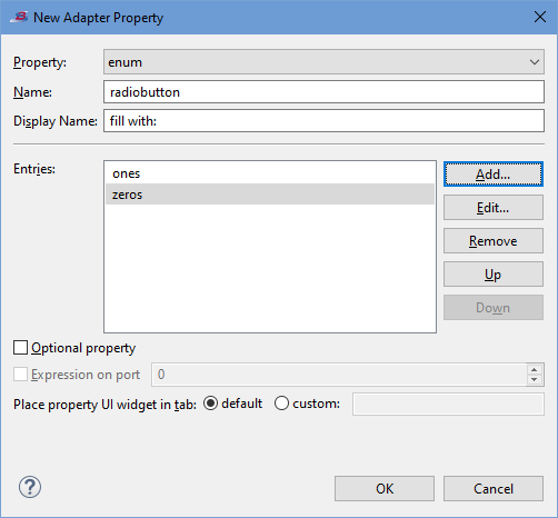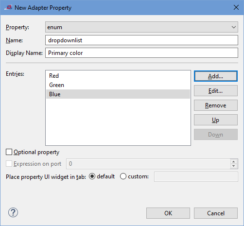 An adapter property is a Java property for your adapter. For each property you specify, the wizard generates code to place a control in the Adapter Properties tab of the Properties view for your adapter. After you add implementation code to the generated stub code, the end-user of your adapter can use these controls to modify the operation of your adapter.