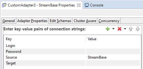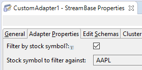 | Schema | Edit Schemas tab | The Properties view for the new adapter or operator is augmented with a standard Edit Schemas tab as used throughout StreamBase. Use this to specify the schema for the field whose name you specify in the Name field of the New Adapter Property dialog. The Properties view tab generated has the title Edit Schemas if you select the default control in that dialog, or you can specify a different tab title with the custom control. |