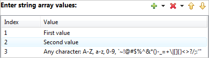 | String[] | Table-like edit control. | A string array control shows as a two-column edit table, with non-editable array index values in the first column and editable