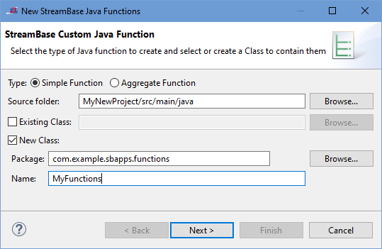 Source folder: The path to an existing folder in which to create your function class. For best compatibility with StreamBase Studio, specify the