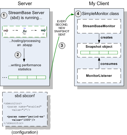 This class monitors a running StreamBase Server, and gathers statistics. It periodically sends Snapshot objects to all registered MonitorListeners.
