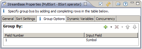 For example, suppose that your input schema included a timestamp and stock symbol field, and you selected the timestamp field to sort on (as shown in the preceding Sort Settings tab. If you did nothing else, BSort would sort all of your input in timestamp order. Now, suppose you still wanted to order by timestamp, but you were interested in the order of each separate stock symbol. To accomplish this, you could use the Group Options tab, specifying the Symbol field as shown in the following figure: