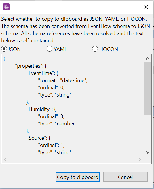 The Copy as JSON Schema to Clipboard feature allows you to convert an EventFlow schema to JSON schema format, along with the ability to copy this schema to the clipboard as JSON, YAML, or HOCON. To copy an EventFlow schema to JSON: