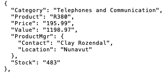 Use the Copy Schema dialog with JSON files that specify a consistent schema, including those with nested arrays. The following excerpt shows a portion of a retail product record in JSON format: