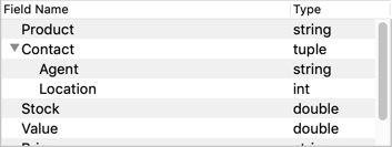 Studio supports hierarchical CSV and TSV files with subfields imported as the StreamBase tuple data type. For this to work, the file must have a header row, which you cannot skip. Edit the header row to specify all tuple fields and their sub-fields using dot notation. For example, the following CSV file specifies seven fields, of which the Contact field has Agent and Location sub-fields: