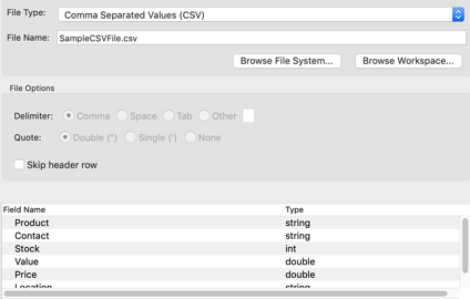 Select this option if you have a CSV or TSV file with non-standard features. With this file type, the File Options section becomes active, allowing you to specify Space or another character as field delimiter, or to specify single quotes when quotes are required, or no quote symbol.