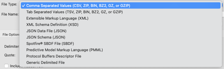 | CSV | .csv, .zip, .bin, .bz2, .gz, .gzip |