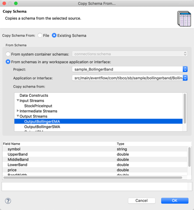 Copy from the schema of any component in any EventFlow application or interface in any project in the current Studio workspace. You can copy the schemas from the named schemas defined in the current module, or from any intermediate stream in any module.