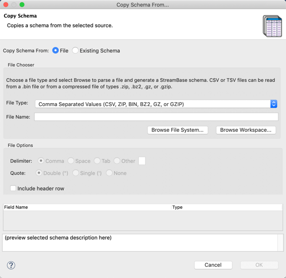 You can copy schemas from a selection of supported file types, browsing either the current Studio workspace or the local file system to locate the file of interest.
