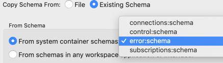 Copy from the schema of one of the streams emitted by the global system container that runs in every EventFlow engine process. For example, you can copy the schema of the standard StreamBase error tuple by selecting error:schema from the dropdown list after selecting the From system container schemas radio button.
