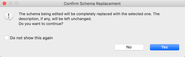 When you copy a schema into a field grid, it overwrites any schema already defined in that grid. If the currently open field grid already contains fields, a dialog prompts you to confirm that you want to replace those fields. Click to overwrite the current fields in the current schema grid.