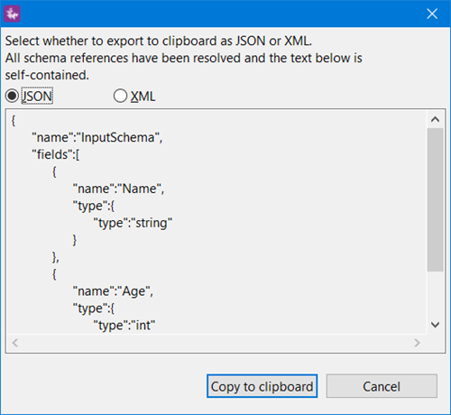Use the command to copy an existing schema to the system clipboard in JSON (default) or XML format. This feature, discussed below, is designed to help you work with external applications that need to interact with StreamBase or LiveView streams, or to paste a schema definition into a StreamBase JUnit test file, if required.