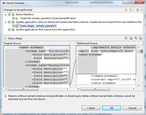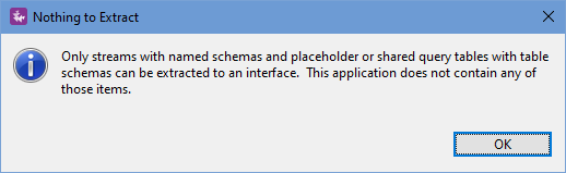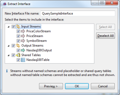 This opens the Extract interface dialog, in which the streams and Query Tables that meet the criteria above are shown. (Non-matching streams and Query Tables are omitted from the dialog.) Select the streams and Query Tables that you want to be encapsulated in the new interface.