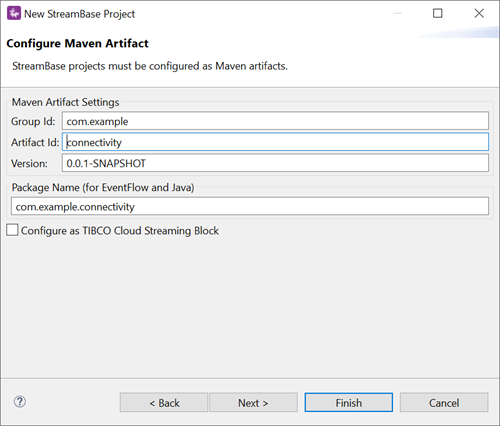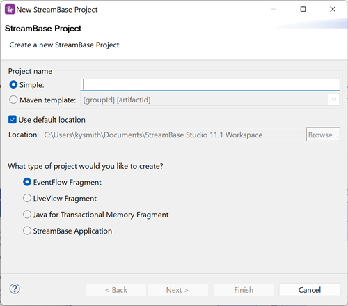 3. By default, StreamBase Studio creates your project in your current Studio workspace, which is the recommended location.