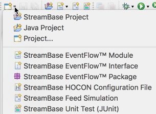 • Click the dropdown arrow next to the New toolbar button (), and select StreamBase Project from the dropdown menu: