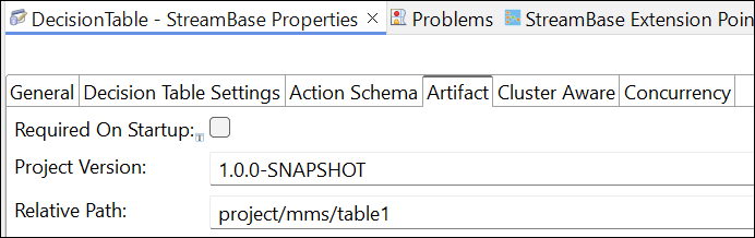 A Model Management Server Decision Table is set using the Model Management Server Project Name and Model Management Server Decision Table Path fields in the Artifact tab. Model Management Server Decision Table files are optionally loaded remotely by setting the properties in this tab as shown below:
