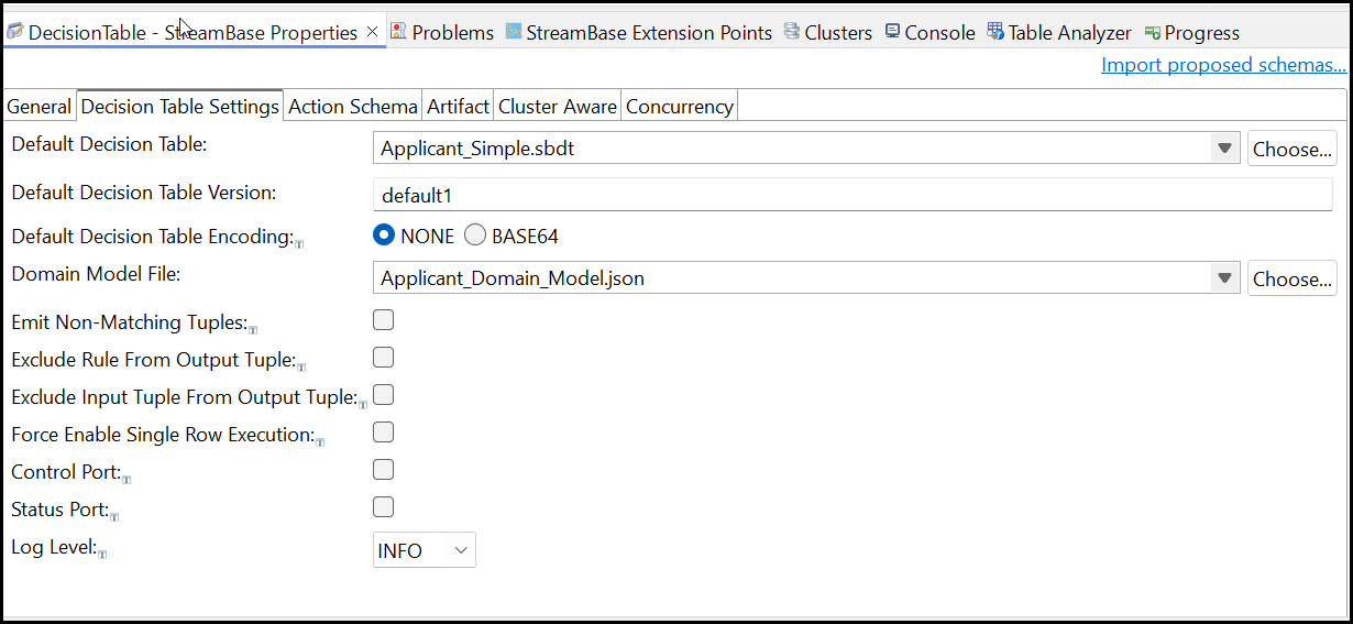 If the option is checked, then the Control port is added to the Java Decision Table operator in the EventFlow module. If the option is checked then in the EventFlow an input stream with the Control Port's schema should be connected to the Control port. The Control Port's schema can be imported into the EventFlow using the Import proposed schema's ... link that is on the right-hand side of the operator's StreamBase Properties tab. |