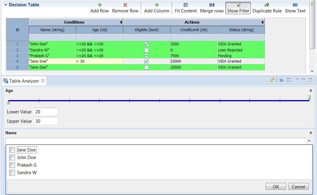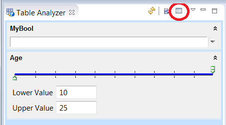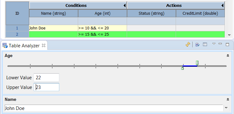 In the example below, two conditions and their ranges or values appear in the Table Analyzer, Age and Name. Adjust the upper