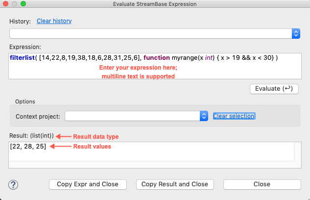 You can use the Evaluate StreamBase Expression dialog as a calculator to evaluate a numerical expression, or as a way to format the results of an evaluation into StreamBase's CSV output format. In this case, use this button to preserve the results of your evaluation.
