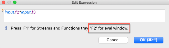 When using this triple F2 method, any expression currently in the Edit Expression window is NOT preserved. If you intend to evaluate the current expression, remember to copy it to the clipboard before the final F2 so that you can paste it into the Evaluate StreamBase Expression dialog.
