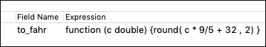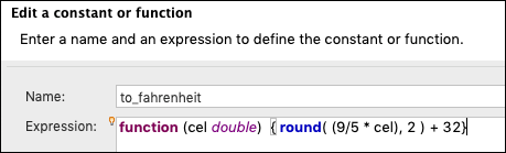 function (c double) { round( c * 9/5 + 32 , 2) }The names you assign to arguments do not need to be used in the function body, but if so, they must be the exact same names. Do not try to assign different names for the same value as an argument and in the function body. (However, you can @define new names in the function body as described below.)