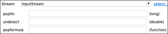 Let's say we want to send in a population count for a city, plus an estimated undercount percentage, and a formula to combine the two into a more accurate population count. Of course, you can apply the formula in a Map operator and/or by means of a function defined in the Definitions tab. But defining the formula as an Input Stream field allows you to change the formula at runtime in a long-running application, or to apply different formulas for different cities.