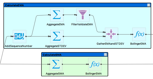 You can gather collections of components on the EventFlow canvas, drawing a box with a colored background around the selected components, and adding a Group title. You can collapse the contents of a Group to a single icon on the canvas. Groups are a visual tool that can help you edit more efficiently, but they do not affect the logic of your application.