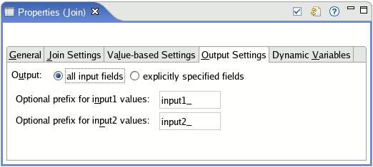 The Output Settings tab allows you to specify the field names and expressions this Join operator should release. Release occurs