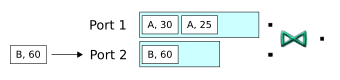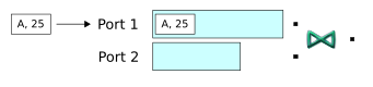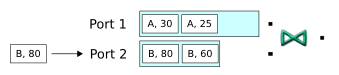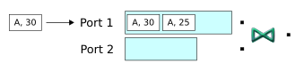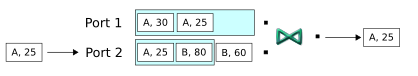 Now, a sixth tuple entering the first input port fills the first input port's window. Note that no output occurs: recall that the matching tuple that was stored earlier in the other window was dropped in the preceding step.
