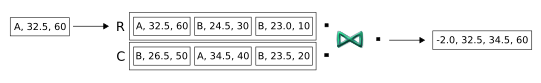 A tuple enters on the ComstockIn port (shortened to C). The value of its first field (B) matches the symbol in the first tuple, but the price difference (in the second field) is less than one. Therefore, nothing is released by the Join operator: